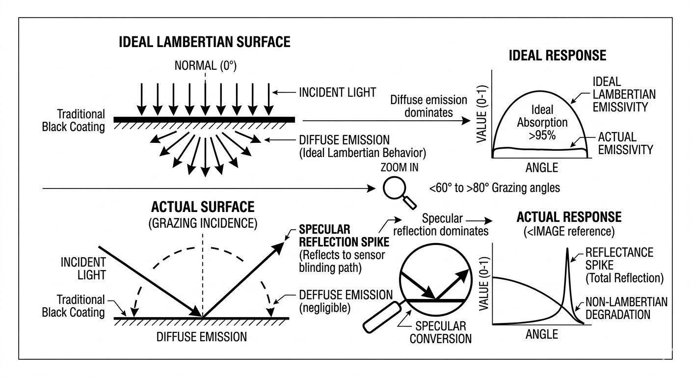在緊湊的機載光電球內部,為了阻擋離軸雜散光,工程師會設計多層遮光罩,然而雜散光子往往是以極大的傾斜角(例如大於 60 度甚至 80 度的掠射角)撞擊這些遮光結構,傳統光學系統所使用的黑體漆或陽極處理表面,在法線方向(0 度)可能具備高達百分之九十五的吸收率;但根據雙向反射分佈函數(BRDF)的物理特性,當入射角極度偏離法線時,這些傳統塗層的微觀粗糙度將無法有效捕捉光子,其物理特性會急遽背離理想的朗伯體(Lambertian Radiator),轉而表現出如同鏡面般的全反射特性,這種掠射角的反射突波(Reflectance Spike)會引導高能雜散光精準地彈射進感測器內部,瞬間導致熱像儀的動態範圍飽和,使 AI 追蹤系統徹底致盲。