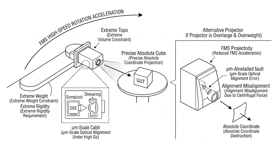 在最嚴苛的 HWIL 閉迴路測試中,紅外線場景投影器通常必須安裝在一個高速旋轉的多軸飛行運動模擬器 (Flight Motion Simulator, FMS) 的外臂上,直接將影像投射給位於中心旋轉台上的 UUT,這對投影系統的體積、重量與機械剛性提出了極端的限制,若投影器的數位發射器引擎 (DEE)、真空杜瓦瓶或冷卻管線過於龐大笨重,不僅會嚴重拖累 FMS 的旋轉加速度極限,其內部的光學對準也會因劇烈的離心力而產生微米級的幾何錯位,徹底摧毀虛擬場景的空間絕對座標。