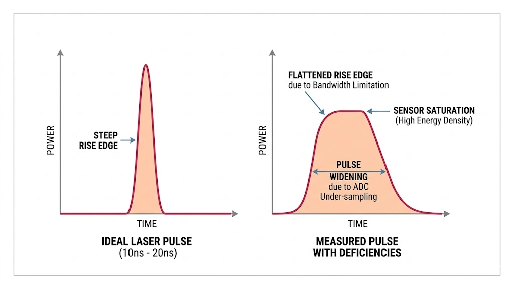 現代雷射標定器的脈衝寬度被極度壓縮(通常在 10 ns 至 20 ns 之間),以換取穿透大氣的極高尖峰功率,當測試系統試圖量測並診斷這些雷射脈衝的時間特性時,傳統的示波器與光電探測器往往力有未逮,如果系統的類比數位轉換器 (ADC) 取樣率不足,或者是偵測器的頻寬受限,極端陡峭的脈衝上升沿 (Rise Edge) 將會被撫平,脈衝寬度也會出現人為展寬,此外高達 10 mJ/cm² 的脈衝能量密度極易導致感測器進入非線性飽和狀態。若無法在承受高能光束的同時,以高於十億次/秒的頻率精準描繪脈衝波形,工程師將無法驗證雷射脈衝間的時域抖動 (Jitter) 是否符合嚴格的軍規公差。