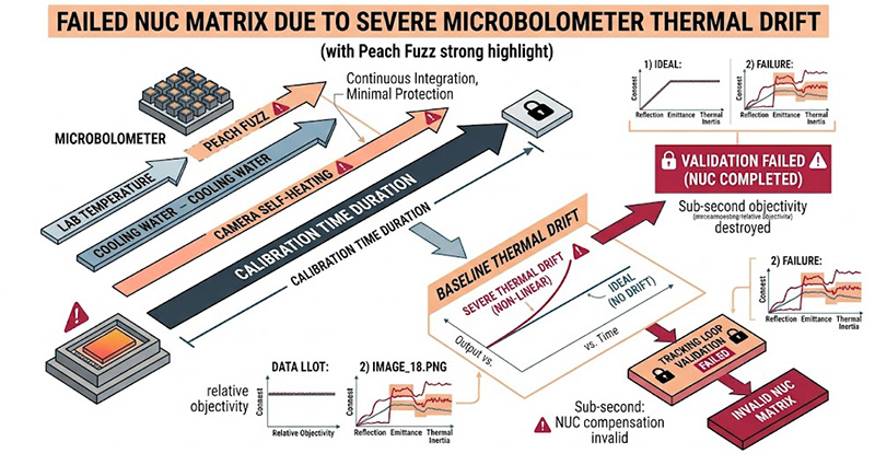 微測輻射熱計的像素處於持續積分狀態(無閘控機制),且缺乏真空低溫環境的保護,當工程師試圖使用「稀疏網格法 (Sparse Grid Method)」對百萬畫素的 IRSP 進行逐一像素的輻射特性量測時,整個資料擷取過程需要耗費大量時間,在此期間,實驗室環境、冷卻水循環機甚至是攝影機本身的微小溫度變化,都會導致微測輻射熱計的基準輸出產生嚴重的非線性熱漂移,這種漂移會徹底摧毀高低溫目標的相對客觀性,導致最終寫入的 NUC 補償矩陣完全失效。
