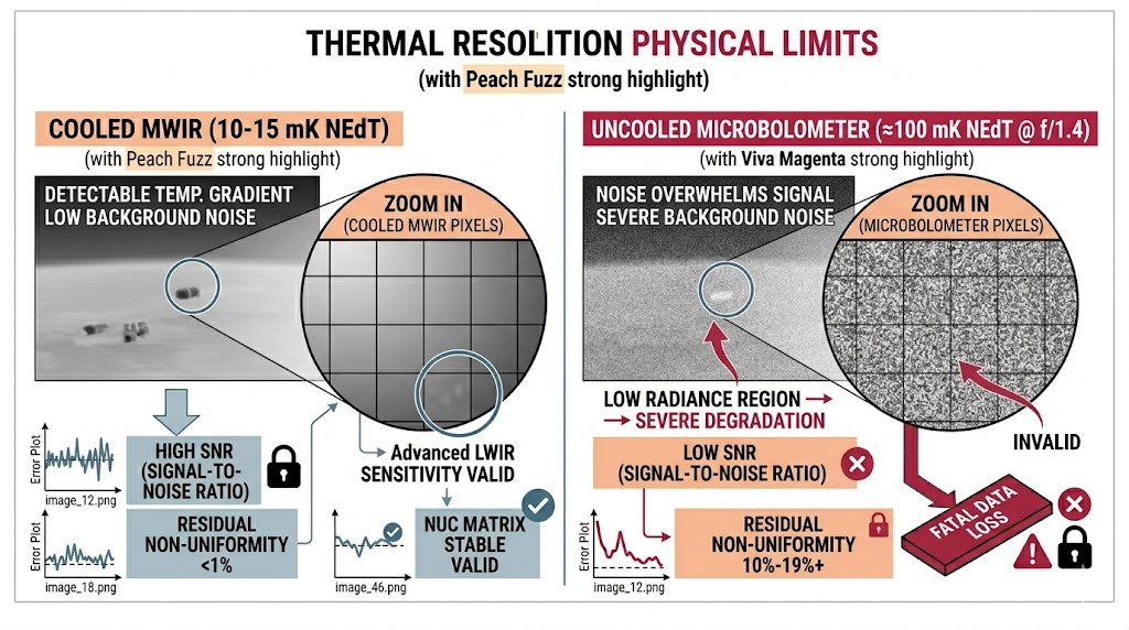 冷卻型中波紅外線 (MWIR) 相機的雜訊等效溫差 (NEdT) 通常可達極具優勢的 10 至 15 mK,但無冷卻的 LWIR 微測輻射熱計在搭配標準 f/1.4 鏡頭時,其 NEdT 僅約為 100 mK;這種高達近十倍的背景雜訊落差,使得 LWIR 相機在觀測接近常溫 (約 300K) 或更低溫的微弱輻射目標時,真實的熱梯度訊號會完全被自身的熱雜訊所淹沒,在低輻射區間,若無特殊的補償機制,殘餘的非均勻性誤差將急遽惡化,導致夜視畫面出現嚴重的雪花或條紋干擾。