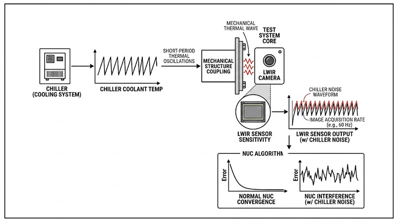 除了長週期的實驗室空調循環會影響相機本體溫度外,用於冷卻測試系統核心的冷卻水循環機 (Chiller) 若其控制迴路不夠穩定,也會產生短週期的溫度振盪。這些微小的熱波動會透過機械結構耦合至 LWIR 相機,形成與影像擷取頻率相疊加的週期性雜訊,進一步干擾 NUC 演算法的收斂。