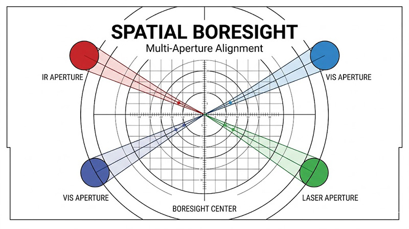 在整合 IR、VIS 與雷射的系統中,任何微小的視軸(Line-of-Sight)偏差都會在遠距離標定時造成致命誤差,測試時,必須將黑體輻射的熱特徵與可見光/雷射特徵精準投射至相機陣列的特定像素上,然而,當傳統測試系統試圖同時投射 MWIR/LWIR 與 1550nm 雷射時,光學元件在不同波長下的折射率差異與色差(Chromatic Aberration),會導致測試靶標在焦平面上產生空間位移,如何建立一個無色差、無分光鏡衰減的絕對空間幾何基準,是進行精確 Boresight 校準的首要難題。