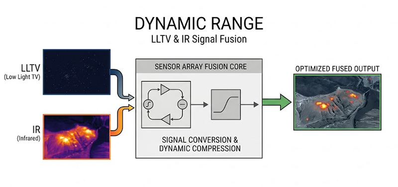 現代 LLTV 感測器需要涵蓋從明亮日光到星光等級(Starlight Conditions)、跨越七個數量級(Orders of Magnitude)以上的動態範圍,在測試多光譜影像融合演算法時,系統必須同時提供極低照度的可見光背景(且不能依賴會產生干涉的衰減濾光片),以及高對比的紅外線熱靶標。若背景光源的均勻度不足,或是紅外線黑體的熱輻射溢出(Thermal Bleed)影響了可見光通道的本底雜訊(Noise Floor),工程師將無法正確驗證影像融合演算法在極端低照度下的雜訊抑制(Noise Suppression)能力。