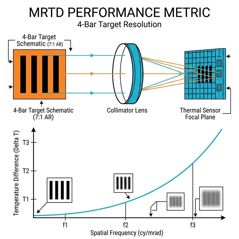 在高空間頻率(極細的四條紋)下,標靶的微觀熱不均勻性以及微測輻射熱計感測器先天的固定圖案雜訊 (FPN) 或 3D 雜訊,會徹底摧毀細微的熱對比邊緣,若測試系統無法提供絕對均勻的背景與無像差的光學投影,所測得的 MRTD 將會是「測試設備的極限」,而非「無人機鏡頭的真實能力」。