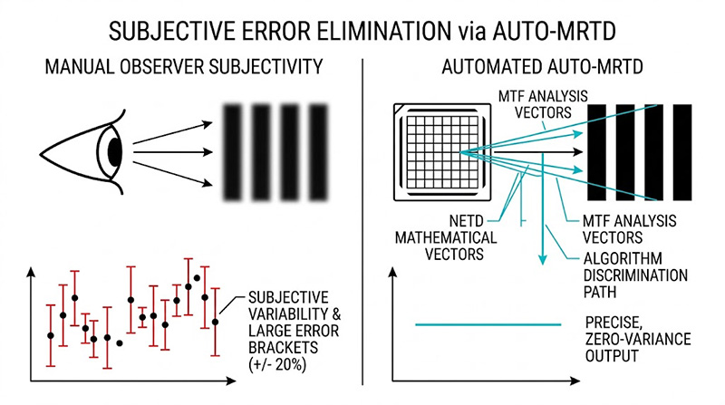 傳統的 MRTD 是一項高度「主觀」的測試,它極度依賴受過訓練的人類觀察者來判定「條紋是否可見」,這種人為判讀不僅極度耗時,且不同觀察者的視覺敏銳度、疲勞程度皆不同,為了降低測量不確定性,必須進行多次重複觀察,但即便如此,這種主觀測量結果仍極易產生高達 的不確定性誤差。這對要求絕對精準的軍工量產測試來說是致命的。