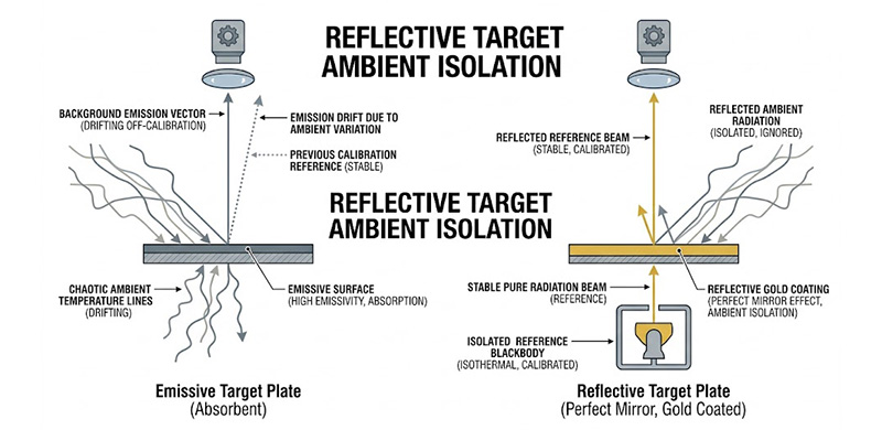 傳統上使用的高發射率塗層標靶(發射式標靶),其行為近似於黑體,會吸收並重新發射實驗室的環境溫度,如果實驗室的環境溫度發生漂移,標靶自身的物理溫度也會隨之改變,導致其紅外線背景特徵偏移,這種熱不穩定性會直接改變熱像儀畫面上的背景灰階值(例如原本是中灰色,卻漸漸漂移至白色),嚴重干擾低頻 MRTD 測試的對比度精準性。
