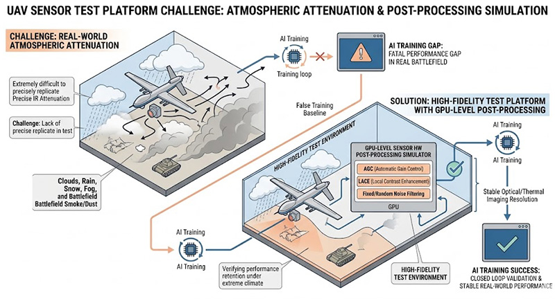 在真實數位戰場中,無人機感測器必須克服容積雲、雨雪、濃霧以及戰場煙塵的干擾,實務測試上,要精準重現大氣對紅外線波長的衰減效應極度困難,同時現代感測器硬體內建了複雜的後處理邏輯,例如自動增益控制(AGC)、局部對比度增強(LACE)與固定/隨機雜訊過濾,若測試平台缺乏在 GPU 層級即時模擬這些後處理特性的能力,工程師將無法驗證無人載具在極端氣候干擾下,是否仍能保持穩定的光學與熱成像解析度,造成演算法訓練與實戰表現出現致命落差。