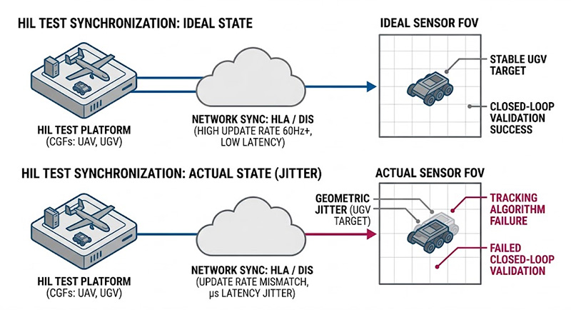 2026 年的戰術規範強調地空聯合作戰(Joint Operations),例如由空中的 UAV 進行大範圍雷射標定與熱成像偵察,再交由地面的 UGV 執行精確防護或武裝運輸,在 HIL 測試環境中,同步模擬這類跨領域的群集(Swarm)網路架構是一大夢魘,測試平台必須透過高層架構(HLA)或分散式互動模擬(DIS)協議,以 60Hz 甚至更高的更新率同步所有實體(CGF),只要出現微秒級的網路封包延遲或畫面幀數不同步,就會導致感測器視野內的目標物件產生幾何跳動(Jitter),徹底破壞追蹤演算法的閉環驗證有效性。