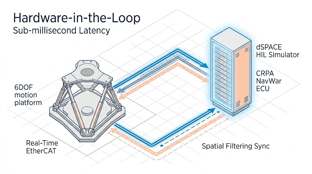現代國防防務高度依賴硬體迴路測試,在測試可控輻射模式天線(CRPA)抗干擾能力或 AESA 雷達追蹤時,虛擬場景主機(如 dSPACE)需要即時計算出一個極具動態的干擾源軌跡,並要求動感平台瞬間做出姿態反應,許多市售測試平台的控制迴路過長,導致端到端延遲高達數十毫秒。這種「時間差」會讓受測的雷達或衛星定位系統產生錯誤的姿態補償計算,導致空間濾波與波束轉向演算法失效,虛擬模擬與物理世界嚴重脫節,讓耗資千萬的測試數據失去公信力。