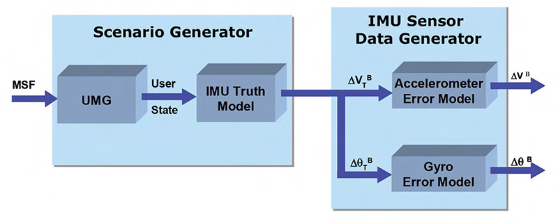 高傳真IMU模擬是GNSS+IMU耦合測試的關鍵環節,場景產生器提供真實運動狀態(User State),經過IMU真值模型(IMU Truth Model)後,再疊加加速度計誤差模型(Accelerometer Error Model)與陀螺儀誤差模型(Gyro Error Model),最終產生帶有真實感測器特性的IMU數據,用於驅動或驗證融合演算法。