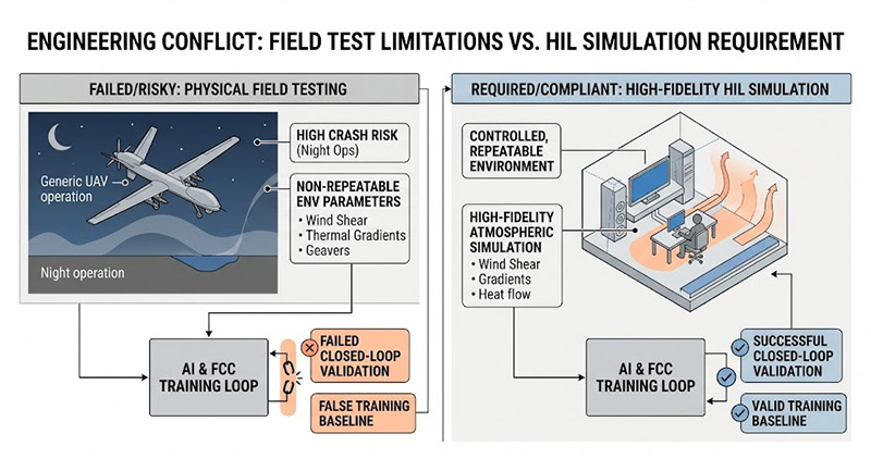 此一趨勢迫使測試驗證的標準變得空前嚴格,在實體空域進行全天候與夜間的極端邊界測試,不僅具有極高的墜機風險,且大氣環境參數(如風切、大氣折射率、熱梯度)具備高度的不可重複性(Non-deterministic),無法滿足飛控邏輯與 AI 目標追蹤演算法在收斂訓練過程中的閉環驗證(Closed-loop validation)需求,因此建立具備高度物理保真(Physical Fidelity)的硬體迴路(Hardware-in-the-Loop, HIL)模擬環境,成為唯一合規的工程解決途徑,實務上工程團隊在建構此類系統時,面臨著三大難以跨越的技術難題。