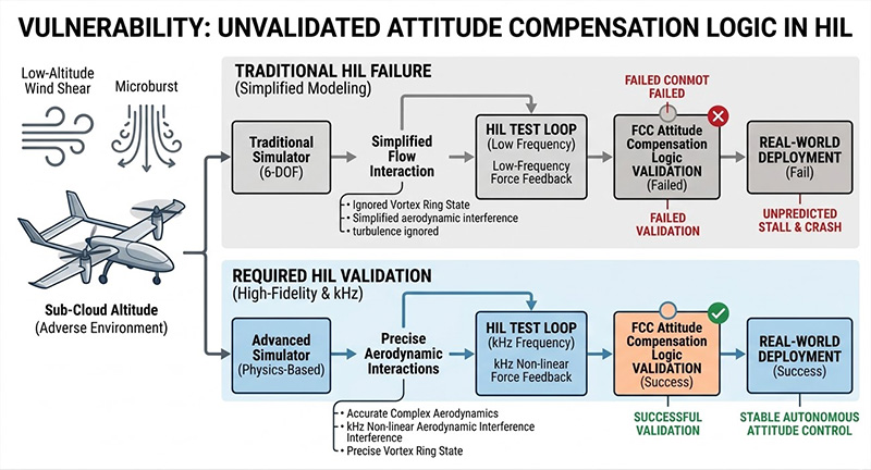 VTOL 固定翼無人機最脆弱的飛行階段,在於起飛後從垂直推力過渡到水平氣動升力的轉換期(Transition Phase),在次雲層(Sub-Cloud)高度,飛行器極易遭遇強烈的低空風切與微爆流(Microbursts),傳統模擬器往往僅採用簡化的六自由度(6-DOF)通用力學模型,無法精確運算多旋翼在複雜氣流交疊下產生的渦流環狀態(Vortex Ring State)與氣動干擾,若 HIL 測試台無法以千赫茲(kHz)級別的更新率,將這些非線性擾動力回饋給飛控系統,將導致自主姿態補償邏輯(Attitude Compensation Logic)驗證失真,進而在實機部署時發生無法預期的失速墜毀。