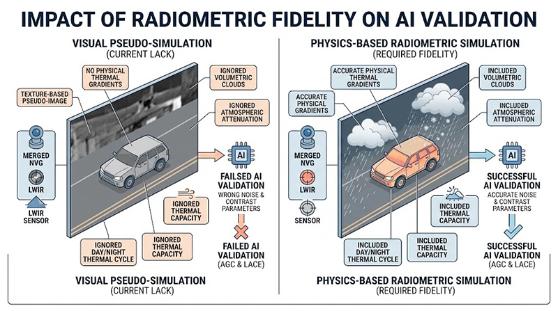 在反恐與邊防任務中,飛行器需於夜間或濃霧中鎖定微小移動目標,這要求酬載系統能融合微光夜視(NVG)與長波紅外線(LWIR)數據,然而工程師在實驗室內難以產生具有物理意義的熱輻射梯度變化,市面上多數的影像引擎僅能提供基於紋理貼圖的「視覺假象」,無法即時運算包含容積雲(Volumetric Clouds)、雨雪散射、大氣衰減效應以及目標物基於熱容量(Thermal Capacity)的日夜熱特徵變化,感測器模擬若缺乏此等輻射度保真(Radiometric Fidelity),將導致 AI 追蹤演算法獲得錯誤的雜訊與對比度參數,無法有效驗證自動增益控制(AGC)與局部對比度增強(LACE)的運作極限。