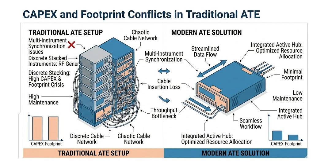 傳統 ATE 架構的龐大 CAPEX 與多儀器堆疊的「空間維度衝突」