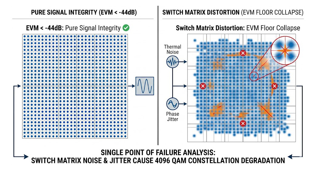 這裡的物理痛點在於,任何被動式切換開關都具有先天性的熱雜訊(Thermal Noise)與寬頻損耗,當純淨的高階調變訊號通過這些被動式繼電器或固態開關時,會因為路徑衰減與阻抗微小不匹配,導致訊號雜訊比(SNR)急遽惡化,更致命的是切換器內部的串擾(Crosstalk)會引入不可預測的相位抖動(Phase Jitter),這會導致 4096 QAM 原本清晰的訊號點在星系圖上發生擴散與模糊,輕易越過狹窄的決策邊界(Decision Boundary),最終儀器測得的 EVM 數值會呈現雪崩式衰退,測試工程師將無法分辨這是 RF FEM 晶片本身的設計瑕疵,還是 ATE 系統內部被動切換元件造成的「偽性失真」,導致產線良率出現毀滅性的誤判。