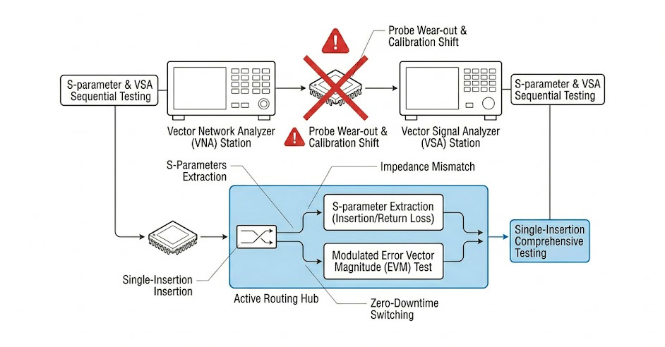 這種「二次下針(Dual-Insertion)」的流程在高速量產線中是絕對不可接受的,頻繁的機械接觸不僅會導致昂貴的射頻探針(RF Probes)或治具迅速磨損,每次拔插更會徹底破壞原本極其嚴謹的射頻校準平面(Calibration Plane),微波頻段下,連接器只要產生幾微米的幾何偏斜,就會導致相位與駐波比(VSWR)的劇烈飄移,若試圖利用複雜的外部開關矩陣將 VNA 與 VSA 硬切換到同一個測試座上,又會陷入被動元件損耗與雜訊污染輪迴;缺乏一種具備主動式補償、且能同時無縫處理 S 參數網路分析與高階調變訊號收發的高整合度路由中樞,產線的測試時間(Test Time)與維護成本將永遠居高不下。
