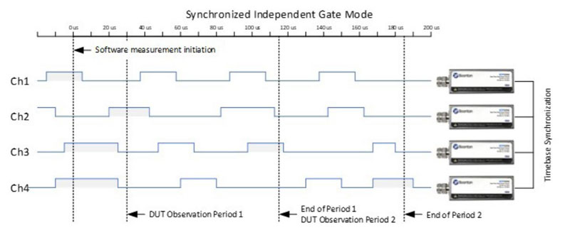 圖 1 展示了一個採用同步獨立閘控模式進行多通道量測的應用範例,在此 4x4 MIMO Wi-Fi 晶片組的測試情境中,系統在共享的時間基準之上建立了多個觀測週期 (DUT Observation Period),透過此模式,工程師能夠清晰判斷來自不同資料串流的訊號封包是否精準對位,或是否存在非預期的重疊現象,這對於分析 MIMO 系統的時序特性與通道間協同工作效能至關重要。