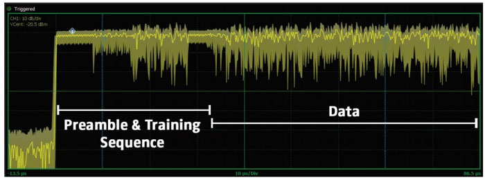 在現代無線通訊技術的快速發展下,對 Wi-Fi 訊號進行精確的射頻功率量測至關重要,特別是為了捕捉如功率衰減、訊號失落和脈衝漂移等關鍵的波形異常現象,通常需要對整個 Wi-Fi 資料串流進行量測;然而,在許多特定的應用情境與測試需求中,採取更聚焦的方法,針對 Wi-Fi 封包的特定部分進行深入分析與測試,也具有同等的重要性;舉例而言,訊號的前導碼 (preamble)區段(如圖 1 所示)扮演著接收器的初始指引角色,使其能夠為即將到來的資料做好準備,並與發射器達成同步,依據不同的應用與測試需求,工程師可能需要擷取僅針對封包的前導碼區段,或其後隨的資料部分的關鍵量測數據,例如峰值功率、平均功率和最小功率。