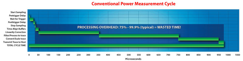即時功率感測器可以平行執行多個步驟,並且是在完整的擷取速率下進行,因此,在觸發事件發生後,無需停止擷取以等待處理階段跟上。