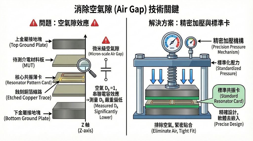 在帶狀線共振法中,最大的技術挑戰在於「接觸」,如果待測板材與諧振卡或接地塊之間存在微米級的空氣隙,由於空氣的 Dk 為 1,會串聯在電容結構中,導致測量出的 Dk 值嚴重偏低,為了解決這個問題,專業的 Z 軸測試治具通常具備以下特徵: