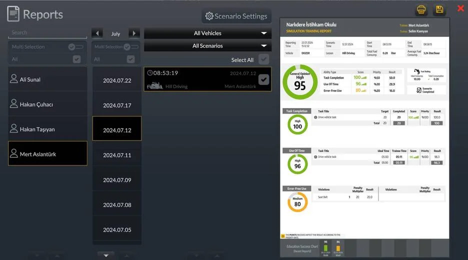 無論是執行挖掘機、挖掘裝載機還是堆高機模擬,系統每次都會產生一份詳細的報告;技能評分、錯誤類型和任務效率皆會自動記錄,以支援教練進行評估;這些分析數據有助於識別優勢、找出弱點,並引導學員進行持續的多機種操作改進。