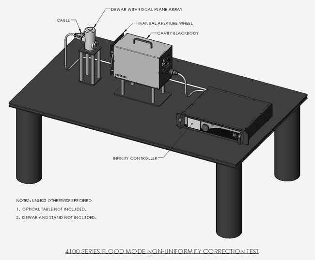 此圖為使用 SBIR 4100 系列腔體黑體執行 Flood Mode 非均勻性校正 (NUC) 測試的標準實驗配置,在此設置中,由 Infinity 控制器精確設定溫度的 4100 黑體,作為一個大面積、均勻的紅外線輻射源,其紅外輻射以 Flood Mode(全幅照射模式)投向待測物,即裝設於杜瓦瓶 (Dewar) 內的焦平面陣列 (FPA) 感測器;此測試目的在於獲取 FPA 上各個感測單元的響應數據,用以計算並補償其固有的非均勻性,進而提升最終成像或量測的品質與準確度;圖中亦可見黑體前方裝有手動光圈輪,可用於調整輻射特性。