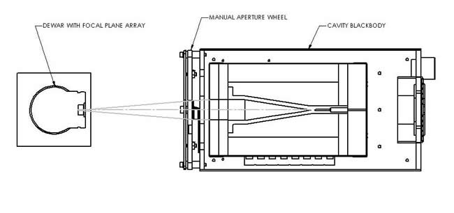 此示意圖為 SBIR 4100 系列腔體黑體與待測杜瓦瓶 (Dewar) (內含焦平面陣列 FPA)對準配置的俯視剖面,圖中揭示了黑體核心的特殊腔體幾何結構,此結構經最佳化設計以確保高發射率及均勻的紅外輻射;輻射線從受控溫的腔體內部發出,通過位於出口處的手動光圈輪選定光孔,最終精確地投射到杜瓦瓶 (Dewar) 窗口,並被 FPA 感測器接收;此設置清晰地展示了從紅外光源到感測器的光路徑,是進行紅外感測器校準和響應特性量測的基礎配置。