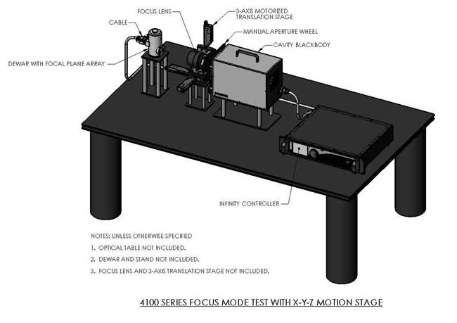 此圖展示 SBIR 4100 系列腔體黑體應用於「聚焦模式 (Focus Mode)」測試的典型配置,此設置在黑體與杜瓦瓶 (Dewar) 之間加入了聚焦透鏡 (Focus Lens),將來自黑體(經光圈)的紅外輻射匯聚成光點,投射至杜瓦瓶 (Dewar) 內的焦平面陣列 (FPA) 上;黑體安裝於三軸 (X-Y-Z) 電動平移台 (Motorized Translation Stage),可精確移動光點以掃描 FPA 或定位於特定圖像元素;此配置常用於量測 FPA 空間響應、MTF 等特性;黑體溫度由 Infinity 控制器調控。