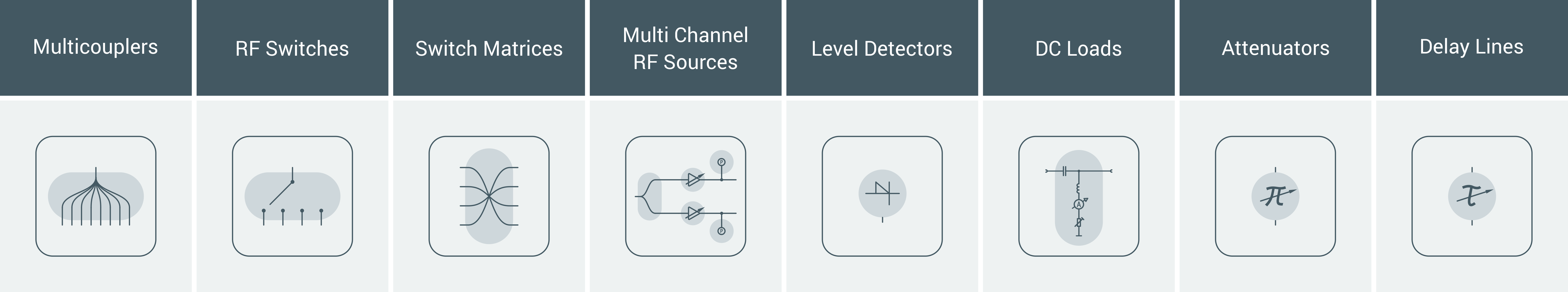 上圖展示 模組化射頻系統 中八種常用元件類型,每一模組皆具備標準化設計與即插即用特性,支援多樣化射頻應用架構: