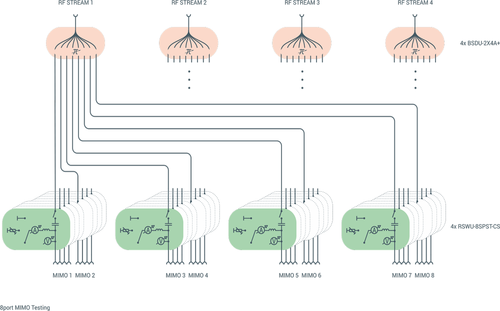 系統提供一套小型化、多頻段 MIMO 射頻訊號路由解決方案,可對應 4 組輸入 × 8 組輸出的 MIMO 天線埠組態,將不同的射頻資料串流穩定傳送至中央通訊測試設備(基地台模擬器)進行集中分析。