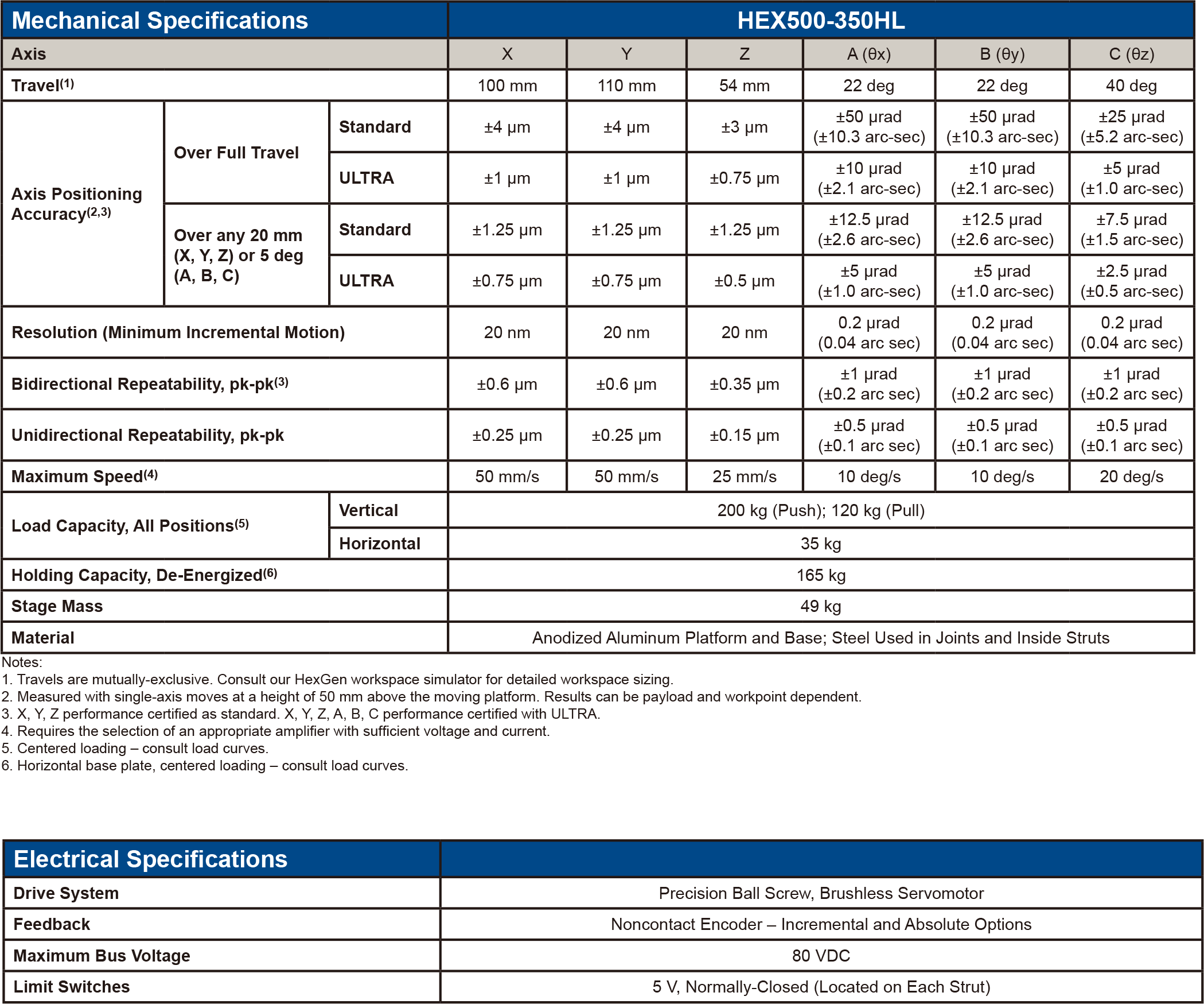 Aerotech HEX500-350HL 採用高剛性結構與高精度運動機構,可確保每一個運動軸的定位誤差極小,所有關鍵組件均經過精密設計與測試,以確保整體系統能夠滿足嚴苛的工業與科研需求,並且提供經保證的定位精度規格,確保應用時的穩定性與可靠性。