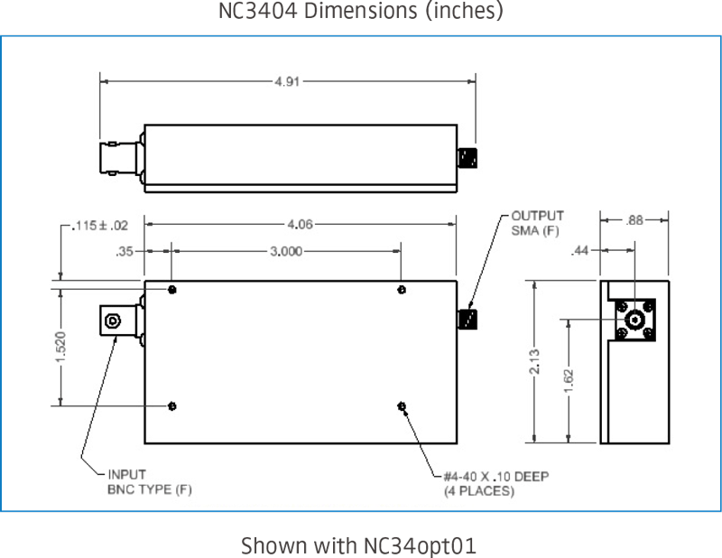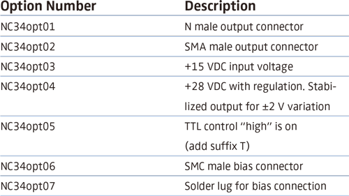 NC3400 系列標準 RF 輸出介面採用 SMA(母頭),標準偏壓輸入介面為 BNC(母頭),亦可根據需求選擇其他連接器規格,以滿足不同應用環境的需求。
