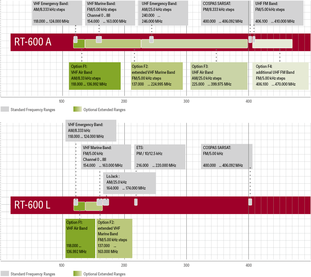 - F2 VHF-海事頻段:137.000 至 224.995 MHz