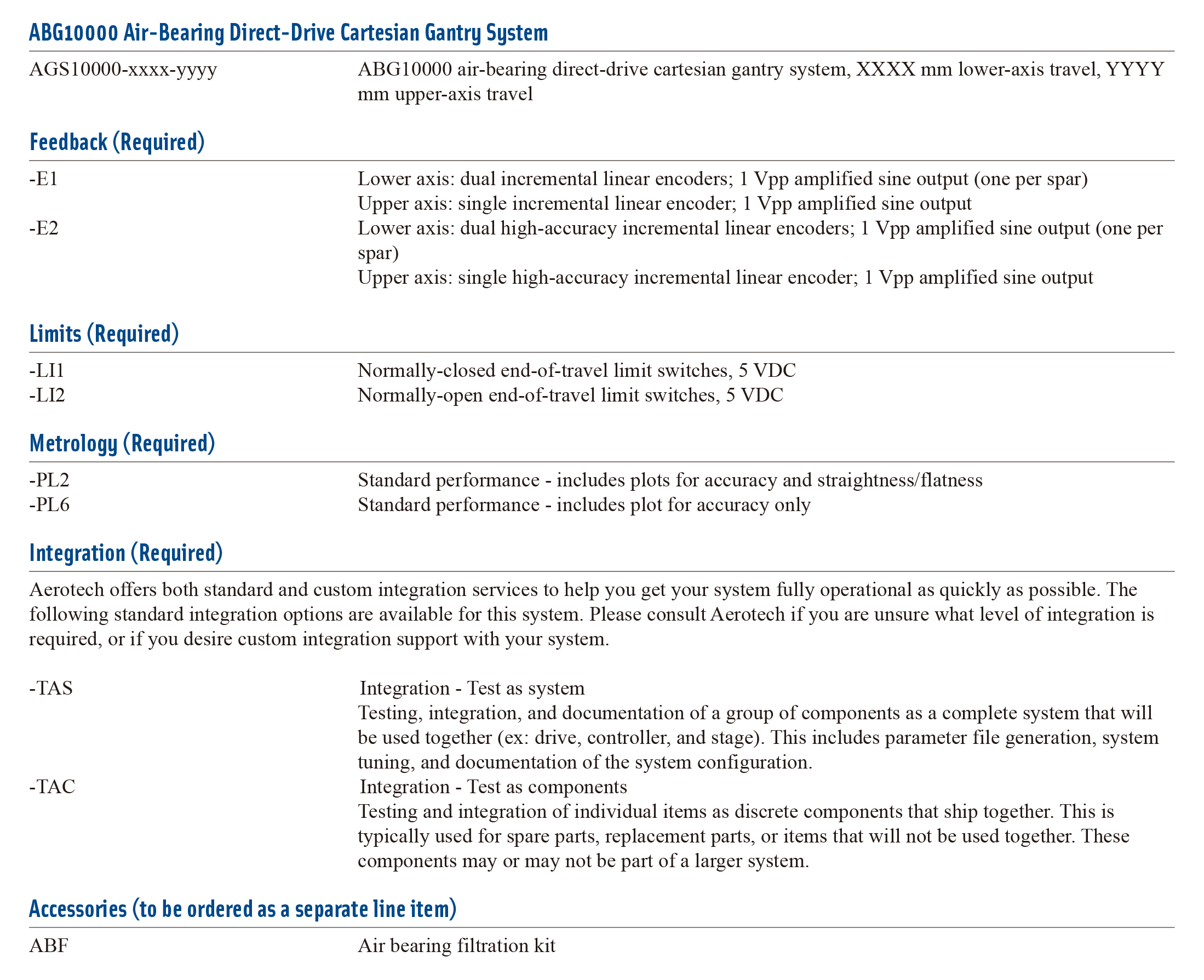 Aerotech 於精密定位與控制系統製造方面的多年經驗,讓您能輕鬆取得完整的即插即用解決方案,常見選配包括 Z 軸、隔震系統、機器基座與控制箱;Aerotech 也提供高性能放大器 (Amplifiers) 與先進運動控制器,並針對 ABG10000 進行優化設計。