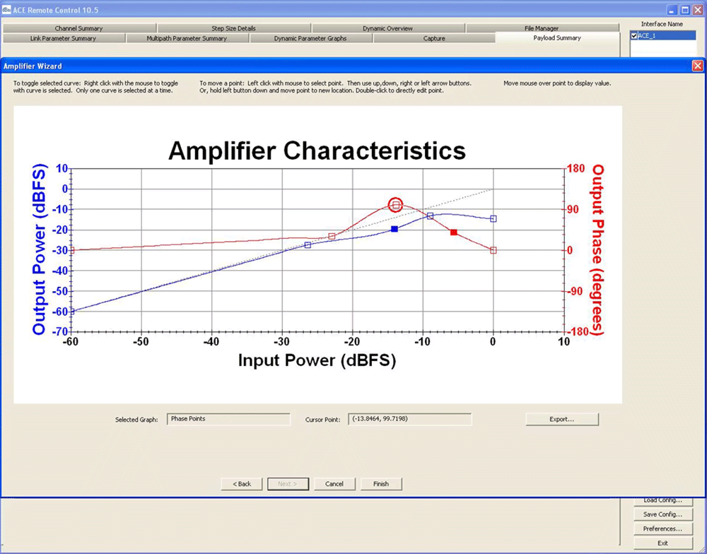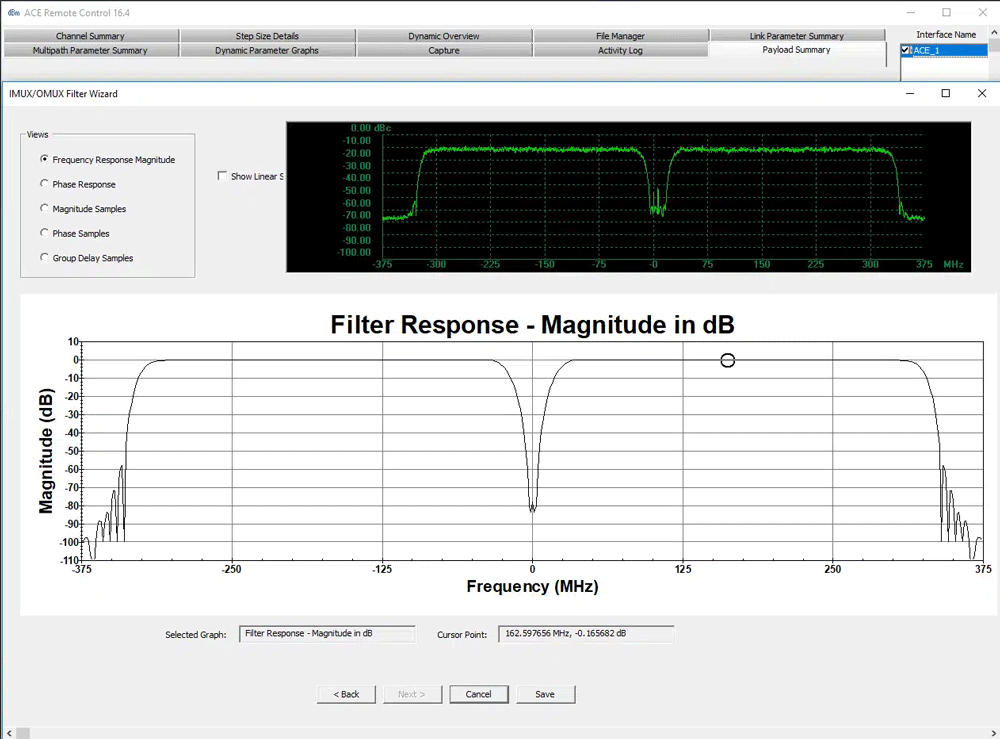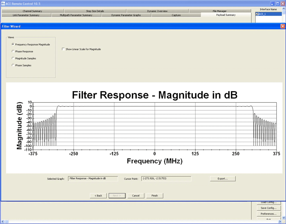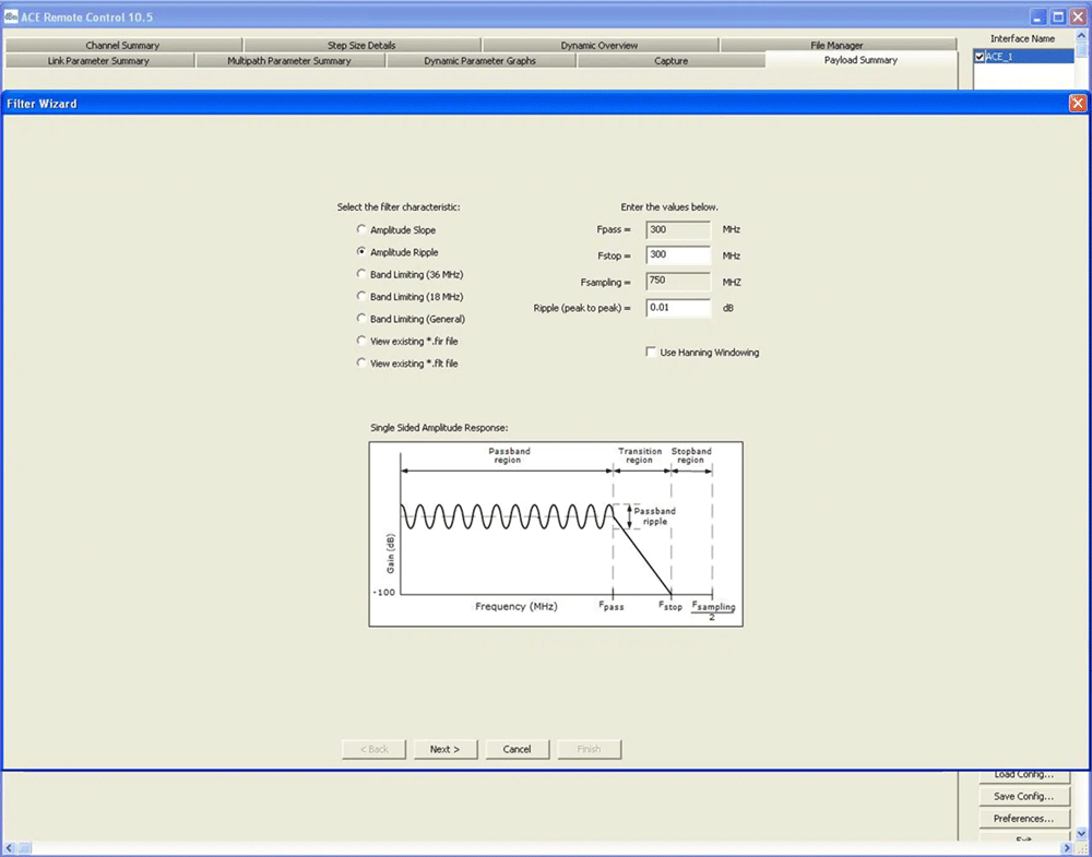 下圖為 ACE Client軟體 的強大且直覺的圖形介面,幫助使用者精確控制ACE9600通道模擬器,並進行詳細的訊號分析,從訊號擷取、濾波器響應設計、相位雜訊測試到放大器特性分析,ACE Client 能夠模擬多種通訊環境中的非理想效應,確保測試結果的可靠性與可再現性。