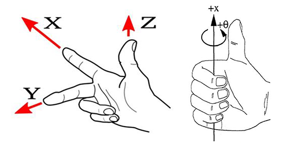 工件座標系中的正向移動方向與軸向方位,依據右手定則定義,如右圖所示,左圖為正向線性移動慣例,右圖為正向角度移動慣例。