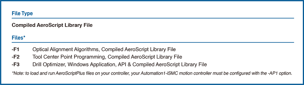 AeroScriptPlus 進階控制程式是特別設計的 AeroScript 函式庫檔案,您可使用產品配置器,客製化所需功能並完成下單,每個程式都為特定的系統與應用提供專屬的預設功能,這些檔案經過加密,並且僅能在已配置 AeroScriptPlus 進階控制程式的 Automation1 控制器上運行。