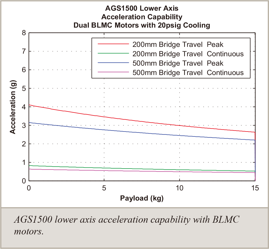 圖中為 BLMC 馬達在 20 psig 空氣冷卻下,AGS1500 上軸的加速度性能;峰值 (Peak) 和連續運行 (Continuous) 狀態下的加速度隨負載增加呈下降趨勢,其中峰值加速度最高達 5 g,隨著負載增加逐漸降低。