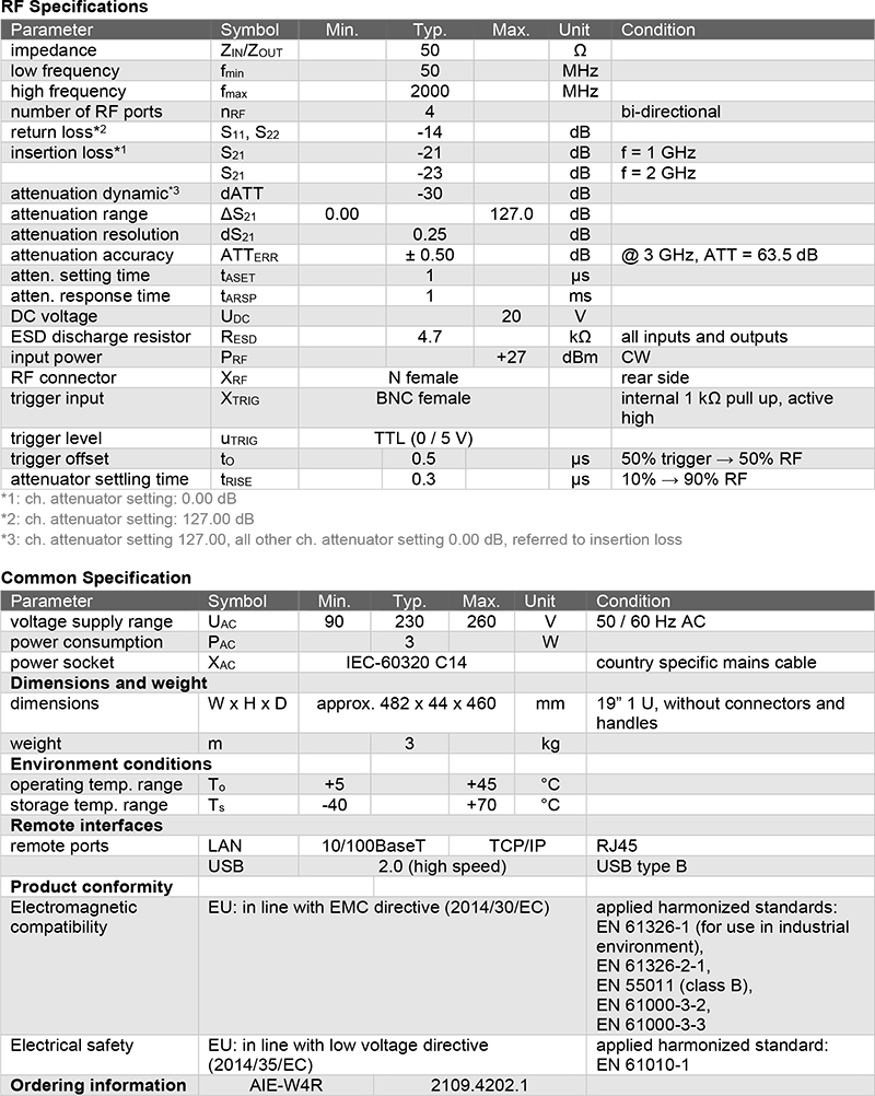 AIE-W4R 可透過 LAN 與 USB 介面進行高效遠端控制,並額外支援 TRIGGER-IO 埠,每次執行切換命令時,觸發介面將輸出精確電壓脈波,可同步驅動系統中其他裝置執行切換動作;此外,該埠也可接收外部脈波以 同步觸發待執行之切換命令;模擬器的衰減器配置可預先透過 LAN 介面載入 SCPI 格式 ASCII 指令字串,在觸發輸入端收到 TTL 上升邊緣(positive edge)後,將 即時執行預設的衰減配置。