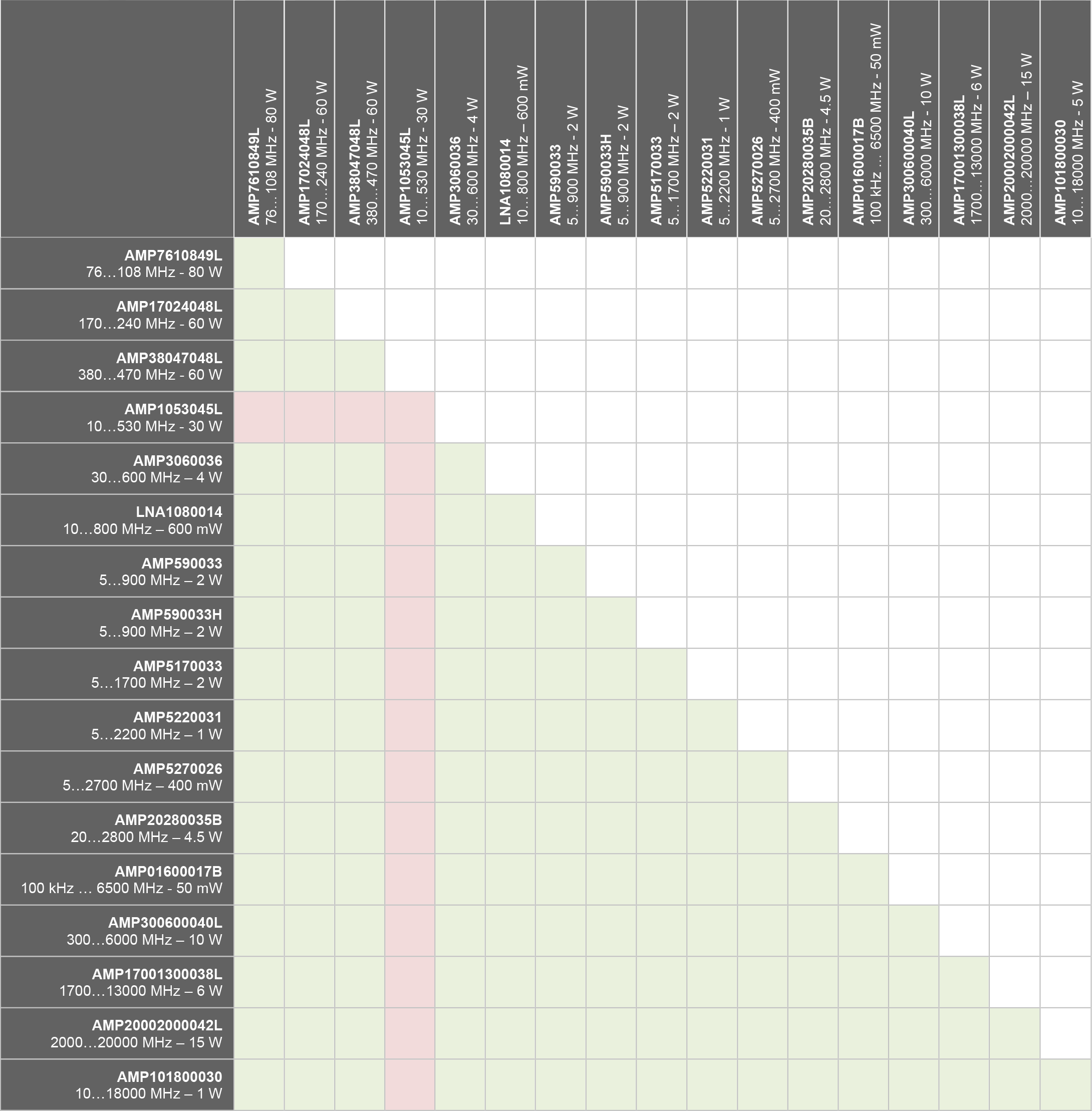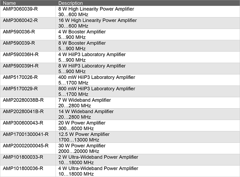 Becker 提供完整且多樣化的 AMP 放大器模組選項,可直接整合於 AMP-LR 機架式機箱中,支援不同頻段與輸出功率等級之應用需求。更多模組規格與選型細節,請參閱下方訂購指南。
