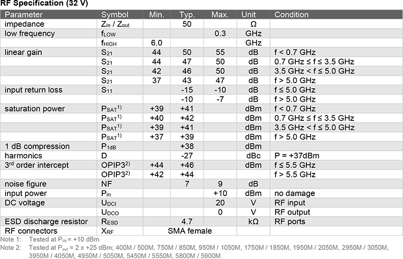 - 中功率輸出等級:+42 dBm(10W typ.),適用於各式射頻測試與驅動用途