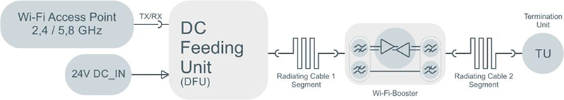 然而,在 5 GHz 頻段下,由於頻率提高,輻射電纜的縱向衰減明顯上升,導致單段可用線長受限,影響涵蓋範圍與系統彈性,針對此技術瓶頸,採用 Becker 所推出之雙向 Wi-Fi 發送/接收放大器(Wi-Fi Booster)後,可有效克服傳輸損耗問題,使多段輻射電纜得以共用單一 Wi-Fi 存取點(AP),延伸涵蓋距離並降低設備數量與安裝成本。
