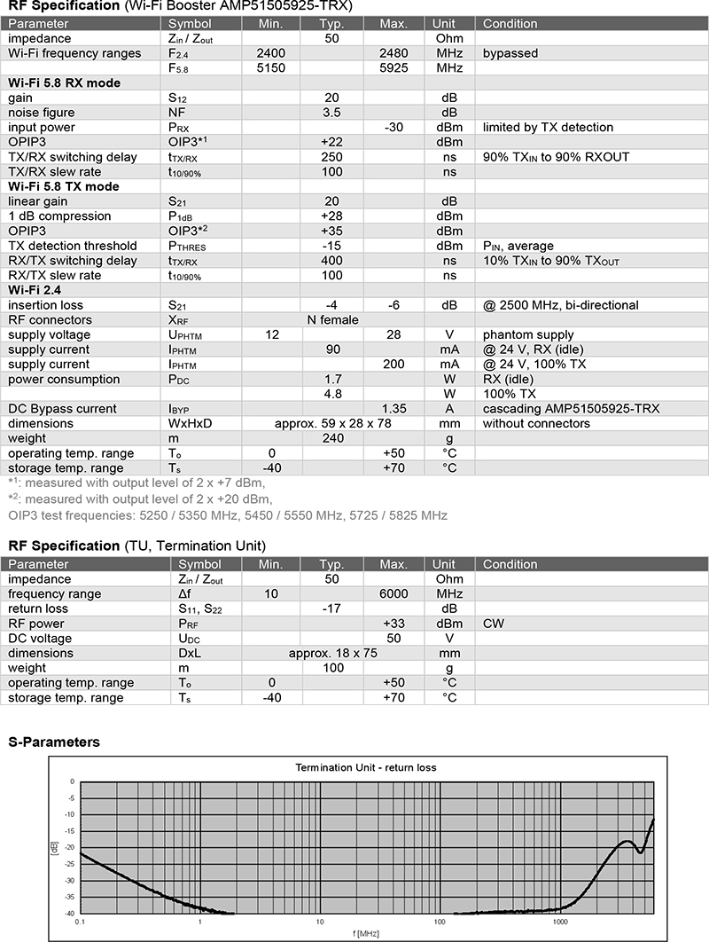 AMP51505925-TRX 為一雙向 RF 增益模組,在接收(RX)與發送(TX)方向均提供典型 20 dB 增益,用以補償輻射電纜因距離造成之縱向訊號衰減;在實際應用中,為支援高階調變模式(Modulation Scheme)所需之訊號品質,任一段輻射電纜上的最小功率建議維持在 0 dBm,使用 Eupen RMC12-CH 輻射電纜時,單一放大器可驅動約 80 公尺電纜段,確保每一節點的訊號強度符合 Wi-Fi 標準要求。