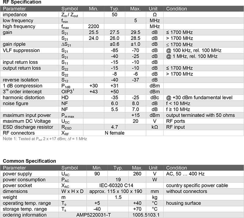 AMP5220031-T 為 Becker 推出之小型化放大器(Amplifier),採桌上型機構設計,搭配 50 Ohm 匹配技術,專為實驗室量測、測試與開發環境而設計;該機種具備堅固穩定的電氣與機械結構設計,可於長時間操作下依然維持高可靠度與一致性性能;其放大器核心設計可在涵蓋多倍頻的寬頻頻段(5 至 2200 MHz)範圍內穩定運行,適用於多種射頻應用場合。