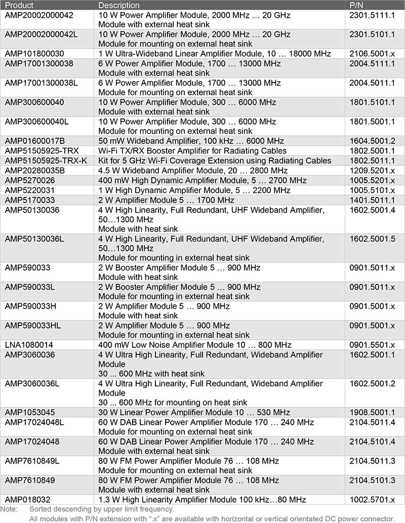 此機種具備堅固的電氣與機械結構設計,可長時間穩定運作;內建濾波器與低雜訊直流供電電路,具備優異的雜散訊號(spurious signal)抑制能力。為避免安裝時發生損壞,供電具備反接保護機制;模組採用單一路直流電壓供電,並透過模組上 LED 顯示供電與模組狀態。RF 連接器為 SMA 母頭型式;此機種需安裝於外部散熱器上以維持溫度穩定;所有 AMP 系列放大器皆採用 50 Ohm 技術設計。