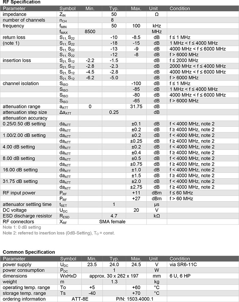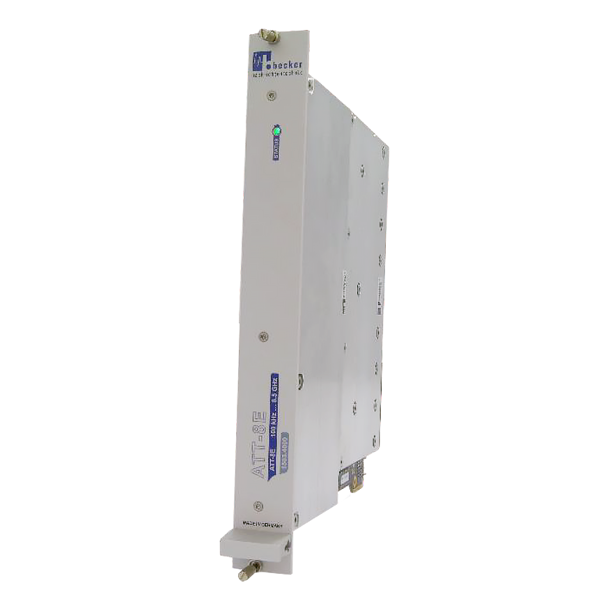 ATT-8E 為一款八通道射頻數位步進衰減器,採用 50 ohms 匹配設計,具備超寬頻操作能力,頻率範圍涵蓋 100 kHz 至超過 8500 MHz,適用於多種高頻應用環境;每一通道具備獨立控制功能,可在 0 至 31.75 dB 間進行衰減調整,最小步進值為 0.25 dB,確保細緻精確的功率控制能力。ATT-8E 採用模組化插槽設計,便於整合於 SR6-11C 系統平台,並透過 SR6-CU 控制器模組 實現遠端操作,控制介面支援 SCPI 架構之 ASCII 字串指令,簡單易用且高度相容。