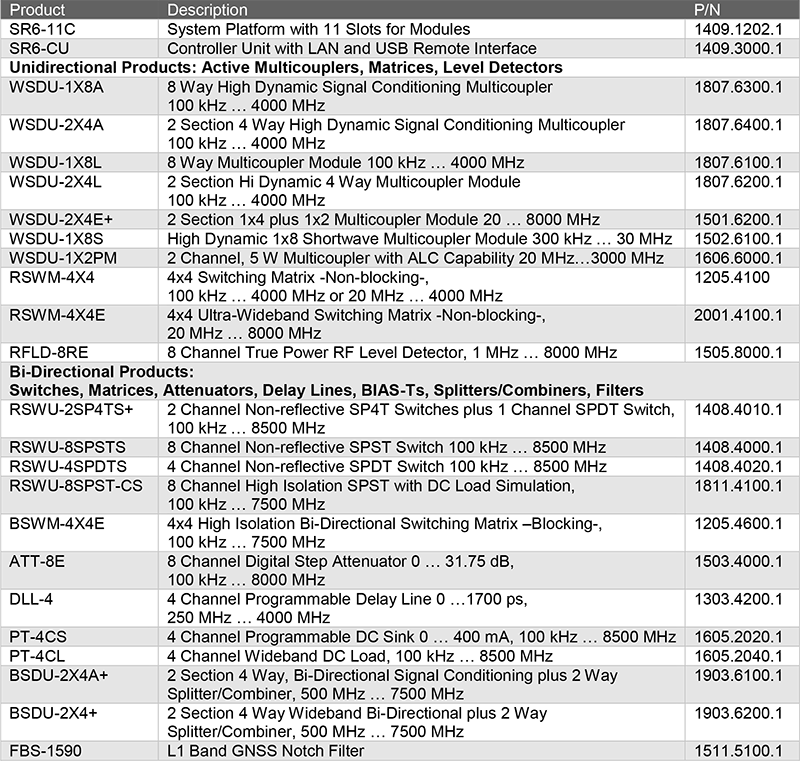 ATT-8E 模組預設整合於 SR6-11C 系統平台中。SR6-11C 提供 11 組模組插槽,可彈性配置射頻開關、矩陣模組、多工器、步進衰減器、BIAS-T、電平偵測器、雙向分配器/合路器等射頻處理模組,構建完整之訊號處理架構與集中控制系統。