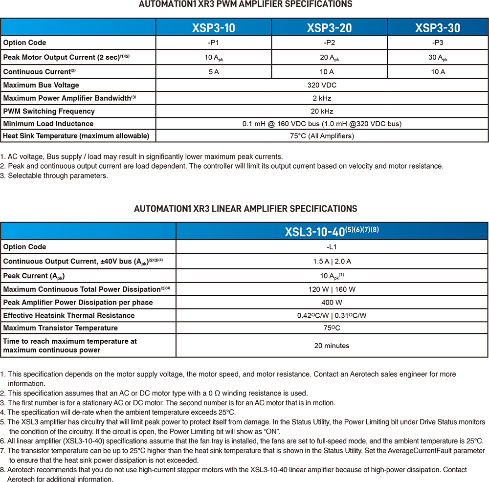 此為 Automation1 XR3 所支援的插入式放大器模組,使用者可依據應用需求,選擇 PWM (脈衝寬度調變) 或線性放大器;如圖中所示的 XSP3-10 (PWM) 與 XSL3-10 (線性) 模組,兩者採用完全相同的外型尺寸與機構設計,確保在安裝與更換時的高度便利性與互換性,提供最大的系統配置彈性。