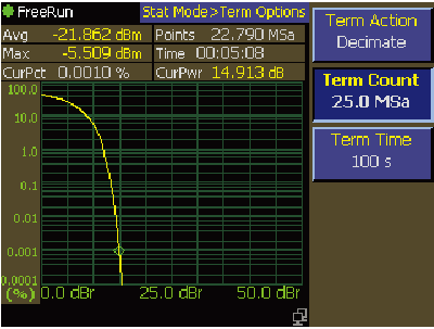 CCDF 值接近 0% 表示最高測得的功率水準,而接近 100% 的 CCDF 值則代表訊號中最常見的功率分佈;此模式可用於分析類似雜訊的訊號,如現代通訊技術所展現的訊號特徵。